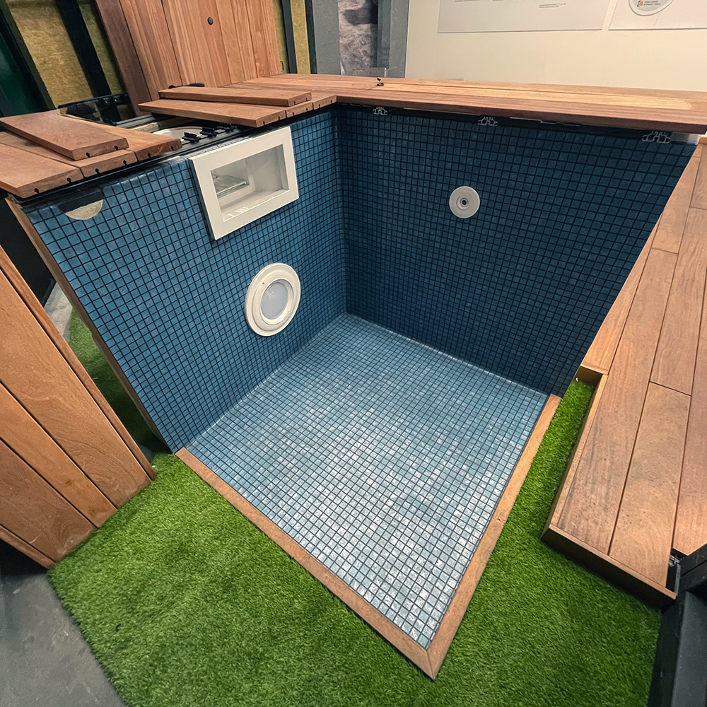 El showroom combina paneles y uniones reales con un área técnica explicativa hasta del sistema MIND para piscinas, una forma de ver, tocar y entender todo el sistema.